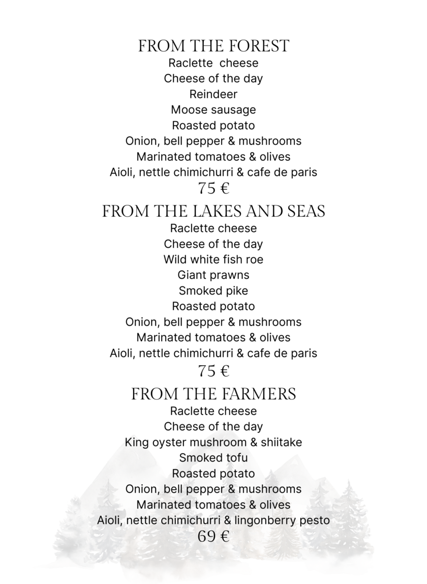 Vintti welcomes all ages, but its atmosphere naturally leans toward adults looking to unwind after a day on the slopes. Think glowing pans, good wine, and the soft shift from after-ski to an easy dinner. Come for a quick bite or settle in for bubbling raclette and a table meant to be shared.